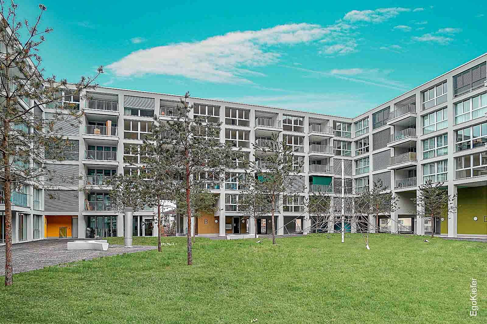 Nach innen eröffnet der Gartenhof unerwartete Natürlichkeit mit einer parkähnlichen Landschaft. Ein riesiger Innenhof, grün bepflanzt, ist ein Rückzugsort für alle, die im Gartenhof leben. Hier kommt man zusammen, hier kommt man zur Ruhe und geniesst das Grüne. Der Innenhof bietet eine 2’800 m2 natürliche Gartenanlage mit Sitzgelegenheiten und Spazierwegen.