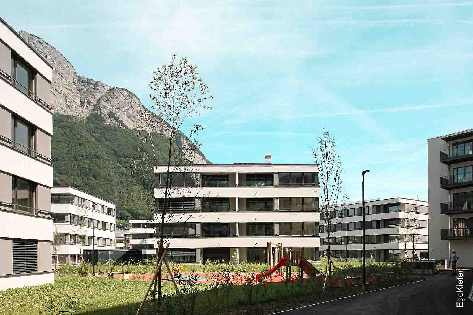 Die ausgezeichnete Lage direkt beim Bahnhof ist prädestiniert für eine moderne, nachhaltige Überbauung. Die Überbauung "Bahnhofpark Areal Ost" umfasst drei Mehrfamilienhäuser, drei Gewerbebauten und eine Tiefgarage. Die moderne Fassadengestaltung Richtung Bahnhof bietet eine repräsentative Aussenansicht. Die grossen Fensterflächen vermitteln Offenheit und Transparenz und garantieren lichtdurchflutete Wohnräume. Mit dem Bahnhofpark Sargans entsteht ein ganzes Quartier im Minergie®-Standard mit dem EgoKiefer Kunststoff/Aluminium-Fenster Ego®One.